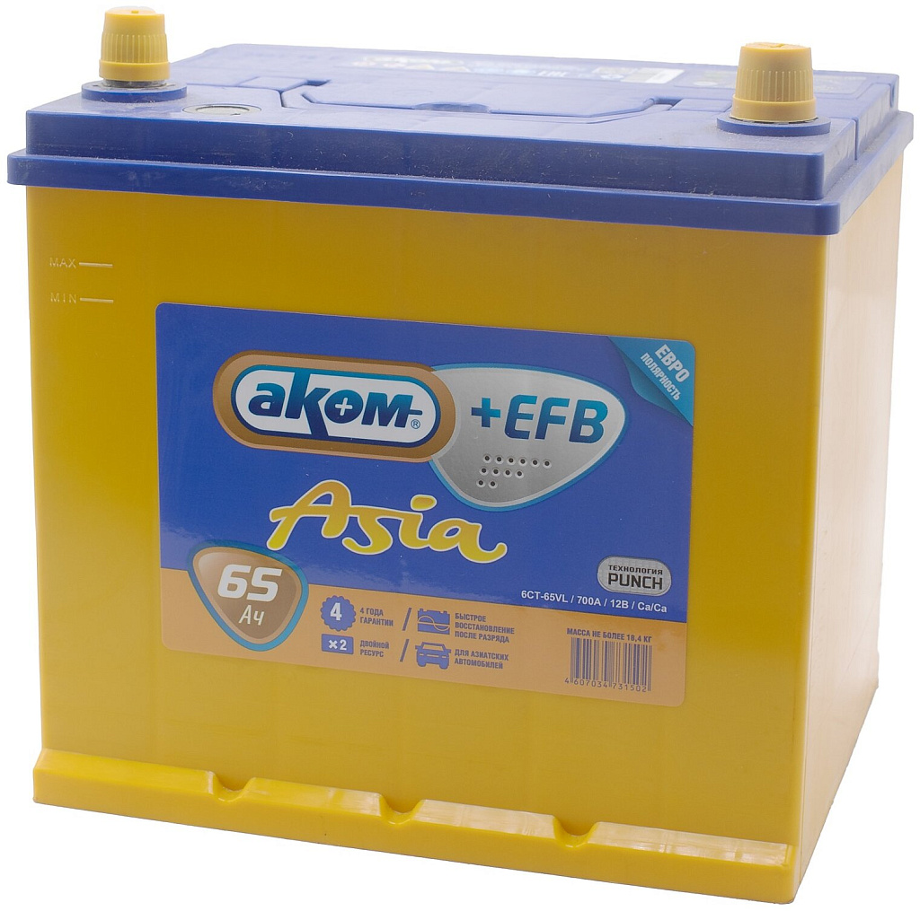АКБ AKOM Asia +EFB — это современная кальциевая батарея с жидким электролитом, созданная по технологии EFB на заводе «Аком» (г. Жигулёвск). Аккумулятор разработан с учётом требований автомобилей азиатского типа и сочетает надёжность с высокой пусковой мощностью