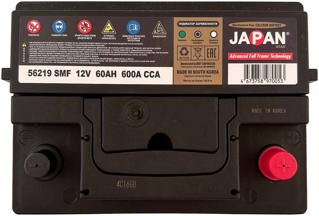 АКБ JAPAN STAR SMF — прочный и надёжный аккумулятор, который обеспечивает уверенный запуск двигателя и стабильную работу всех электрических систем автомобиля на протяжении многих лет.