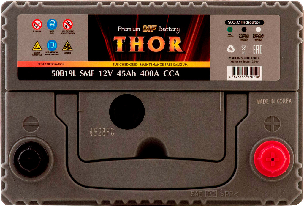 Автомобильный аккумулятор THOR SMF — серия аккумуляторов премиум-класса, выпускаемая заводом BOST CORPORATION (Южная Корея). Производитель применяет запатентованные технологии и материалы высокого качества, обеспечивая стабильную работу и продолжительный срок службы батарей.