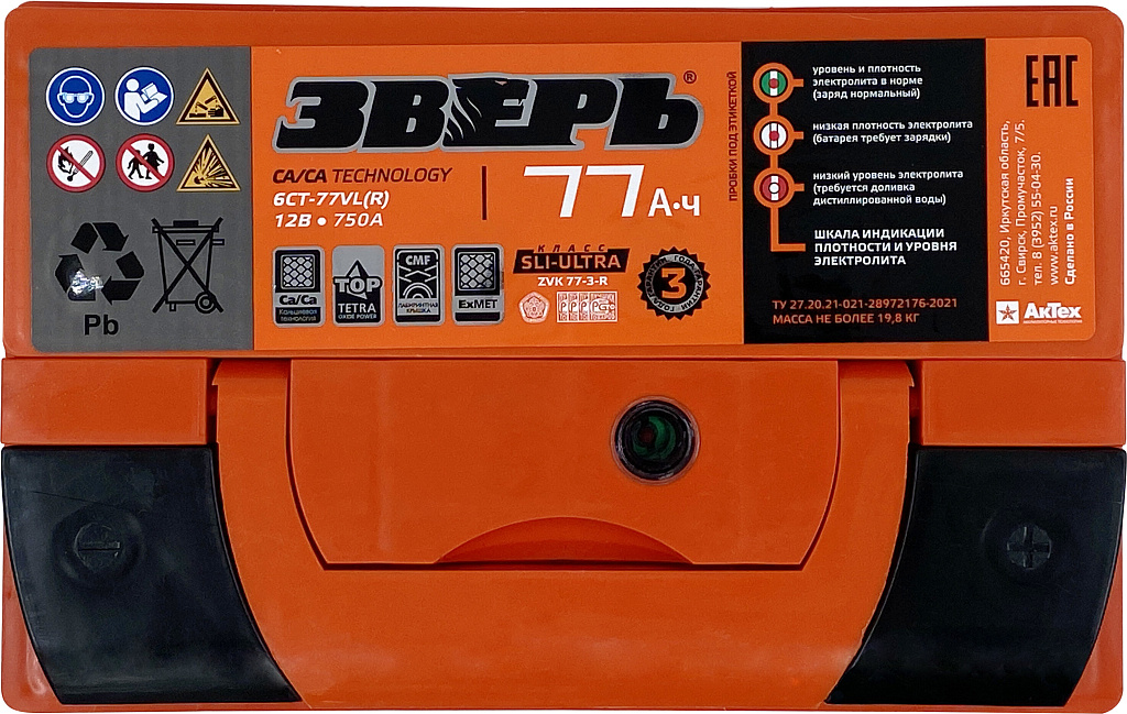 Аккумулятор ЗВЕРЬ 77 Ач 750 А обратная полярность
