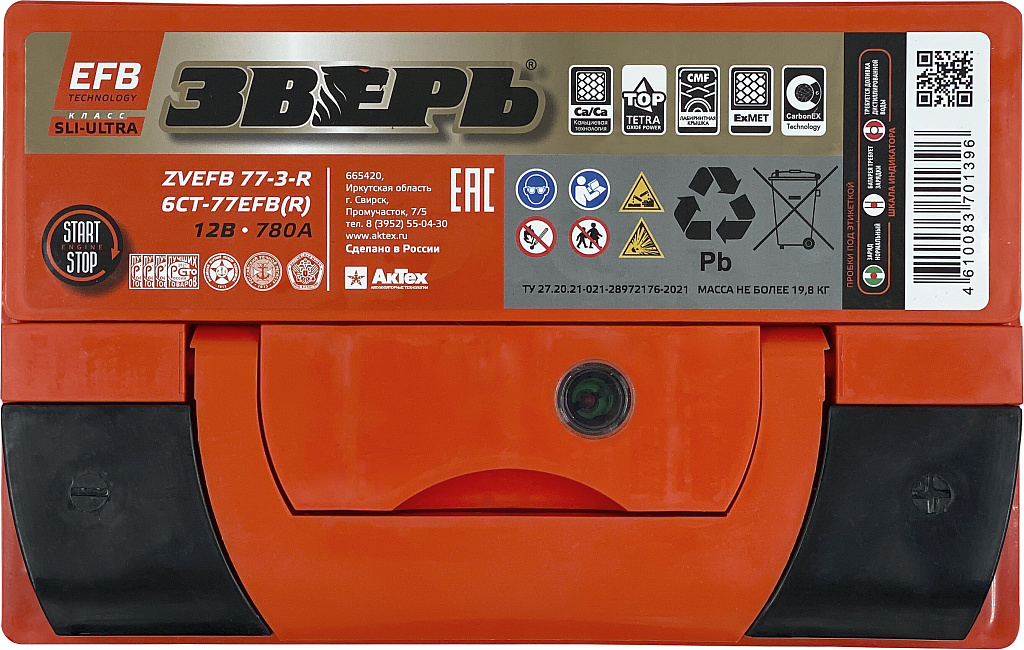 Аккумулятор ЗВЕРЬ EFB 77 Ач 780 А обратная полярность